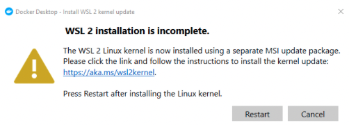 Note: You you install Docker on Windows you may get an ‘WSL 2 installation is incomplete’ notification. No panic, just follow the link and install the kernel (also follow the settings to set it as default on the prompted link.